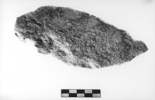 | Description: | Inscribed fragment. Broad surface chip. Appears to be inscribed with a series of plain circles, six of them being preserved in a row 0.082m. long, and another 0.018m. away below the row. Surface weatherd; interpretation not clear. Pentelic marble. | |
