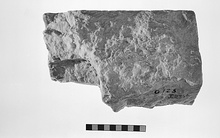 | Description: | Inscribed fragment. Broken away behind and at left. Top smooth with corner of rough picked rectangular cutting. Right side and bottom toothed. Three lines of the inscription preserved. Hymettian marble. | |