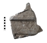 | Description: | Inscribed fragment of grave stele. From a stele of pedimental type, surmounted by an akroterion. Left side and top preserved, and the back, very rough. Plain band with broad bevel between pediment and inscribed surface. Below the letters a sunken panel in which is part of a head, right, in the upper left corner. Four lines of the inscription preserved. Hymettian marble. | |