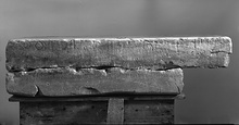 | Description: | Large inscribed base. To be mended from two pieces found separately. The inscribed face, left edge, part of right edge, original top and bottom preserved. The stone was reused upside down as a door sill, and the bottom is much worn. Dedication. The inscription is in two long lines, only the second of which is legible. Hymettian marble. ADDENDA Read by Fourmont. | |