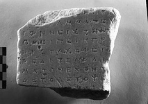 | Description: | Inscribed fragment. Inscribed face and left face preserved. Rough picked back tapers at left edge, perhaps not original. Broken at top, bottom, and right. Decree of tribe or religious organization. Eight lines of the inscription preserved, and one letter in the ninth. White marble. | |