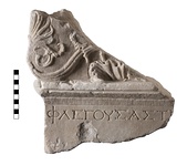 | Description: | Inscribed fragment of grave stele. Fragment from upper left corner. Finished side, and rough dressed back preserved. Part of acanthus scroll decoration, in low relief, remains above the inscribed face. Eleven letters remain. Pentelic marble. | |