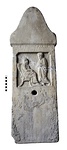 | Description: | Inscribed stele with relief. Mended from two pieces. Complete. In a shallow niche, two figures, bearded, one seated, right, the other standing, left. Twenty-two letters remain. Pentelic marble. | |