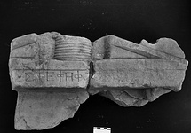 | Description: | Inscribed fragment of stele. Upper right corner of grave stele with pediment top, and framed recessed niche for sculpture. The inscription which occupied two lines, one on lower moulding of the pediment, the other below, has been almost entirely erased. Pentelic marble. ADDENDA Joins with I 3348. | |
