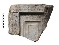 | Description: | Inscribed fragment of grave stele. Preserved left side, top, and back, rough picked. At left, a panel with a coarse ivy leaf. In the center is carved a door. Along the top of the stele, inscription in two lines. Below, over the door, also two lines. The marble is stained black. Pentelic marble. | |
