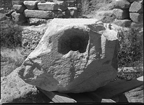 The stone has been reused for left face is roughly cut back to a surface which forms an acute angle with the front, and in bottom broken surface base of a rectangular cutting, and a shallow cutting reprendicular to front surface which may date from reuse.