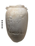 | Description: | Inscribed and sculptured funerary amphora. Well designed pear-shaped body with two thin handles attached to neck and ending in volutes on shoulders. Low relief: elderly man, bearded, standing facing left, draped; above him, his name "ΔΗΜΟΧΑΡΗΣ". He is facing a woman, left, at whose left side is a child wearing a short chiton. The figures much battered. Remains of painted decoration of tongue pattern around shoulder, at base of neck. Below this, on reverse, a band composed of zigzags. Pentelic marble. | |