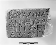 | Description: | Inscribed fragment of statue base. Parts of top, left side, and bottom preserved. In top a segment of a rough shallow cutting. Four lines of the inscription preserved. Hymettian marble. | |