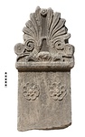 | Description: | Sepulchral stele. Broken away below. A tall tapering stele crowned by an ovolo moulding and fascia with a finial in the shape of a flame palmette springing from acanthus leaves. Between the two halves of the palmette is a small rosette; between the tendrils on either side of the palmette, a phiale mesompahalos. On the face of the stele near its top are two double rosettes in relief. Across the top of the face is the inscription, in three lines. Pentelic marble. | |