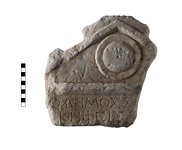 | Description: | Inscribed fragment of grave stele. Back and part of pedimental top, with disk ornament, preserved. Two lines of the inscription preserved. Pentelic marble. | |