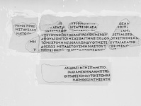| Description: | Inscribed fragment. Rough picked surface at center of top, but not at right angles to inscribed surface; otherwise inscribed face only preserved. Three lines of the inscription preserved. Pentelic marble. ADDENDA Part of IG II2, no. 1104. | |