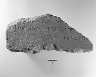 | Description: | Inscribed fragment of statue base. Inscribed face and left side preserved. Surface much worn, especially at left. Base for the statue of a priestess of Demeter. Three lines of the inscription preserved. Pentelic marble. | |