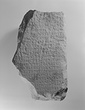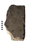 Inscribed face and slightly concave back preserved. Right side apparently re-worked.