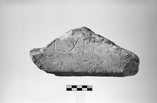 The lower edge of the inscription has a beveled edge, and the single line of the inscription is on the upper of two bands.