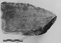 | Description: | All sides broken except for the left, which is finely picked. The left edge of the face of the inscription is damaged. The left side has a smooth band at the edge (anathyrosis ?). Parts of seven lines of the inscription preserved. Hymettian marble. Cf. AJA 56 (1952), pl. 31 b. | |