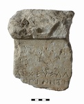| Description: | Inscribed fragment from upper left corner of small stele. Broken at back, bottom and right. Fascia of crowning moulding mostly chipped away, but part of original flat rough picked top preserved. Note a pair of large holes (for repair?) through area of moulding 0.025m. from left side. On broken back, open hole (left) ca. 0.01m. in diameter; other hole filled with lead and piece projecting. On broken front surface, both holes filled with lead or some kind of mortar. Parts of three lines of the inscription preserved. Pentelic marble. | |