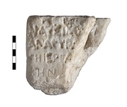 | Description: | Inscribed fragment of statue base. Moulding on bottom indicates that it was top of pedestal statue base. Inscribed face shows that this is the left portion. Reverse and top are rough picked. Upper lines of the inscription badly eroded; non-stoichedon. Letter spacing: 0.009m. Stone is smooth on inscribed and left sides. White marble. | |