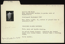 | Description: | Inscribed lekythos. Foot, neck and handle missing. In relief three figures. Standing man shakes hands with seated woman. Between them a standing woman. White marble. | |