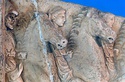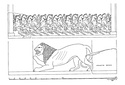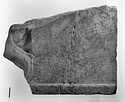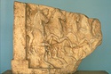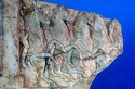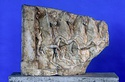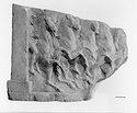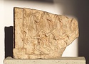 | Description: | Inscribed fragments. Mended from two pieces. Bottom and left side preserved; full thickness intact. Top broken away and right side unevenly broken. At left is square pilaster on square base. On high relief are represented five charging horses with riders to right and overlapping. At left an older helmeted horseman appears half hidden behind pilaster. Next two horses to right have youthful riders, seen in profile between heads of horses. Only left hand of fourth rider from left is visible. At extreme the fifth horse is more widely separated from its neighbor and much of the body of the youthful rider is visible with part of the hindquarters of his horse. Holes at neck of animals; hand indicate attachment, partially of rein and/or staffs. Figure are in high relief and start on a projecting base line. On back of relief is at left part of a lion in relief of large scale; preserved are part of rear left leg and tail. To right is:"ΛΗΟΝΤΙΣ ΕΝΙΚΑ". At bottom is projecting band roughly picked and projecting 0.007m. In bottom an ancient drilled hole. Large crystal, white marble. | |