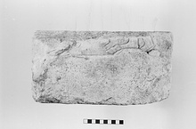 | Description: | Broken on top, re-cut on sides, surface chipped and worn. Lower edge of dedicatory relief, with inscription below relief. In relief lower parts of four horses' legs and hoofs, with horse in prancing position. On left side of relief, part of another figure preserved. Near right side (as preserved), inscription. White marble. | |