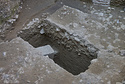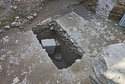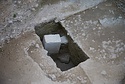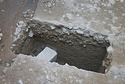 Statue inlay is rectangular with rounded corners and measures roughly 0.52 x 0.265 x 0.05m deep. Inlay cuts into a second Hellenistic inscription. No visible cuttings for dowels or clamps.