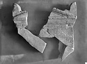 | Description: | Two fragments from the upper part of a stele with pedimental top. Both corners, with finials, are preserved, the right hand piece mended from six fragments; the left hand, from two. The central part of the pediment is missing, and the two parts do not join, but the original width appears to have been ca. 0.49m. at the pediment, and 0.434m. at the stele top. Pentelic marble. | |