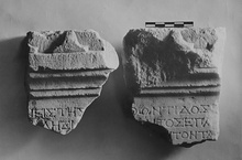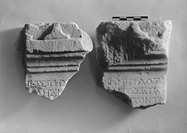 | Description: | Fragments of inscribed stele, crowned by moulding. Fragment Η 330 a), broken away on both sides, behind and below. Crowned by a cyma recta. Parts of two lines of the inscription preserved. Fragment Η' 649 b), original rough picked surface preserved on top. Note peculiar pattern cut along front face at top. Part of three lines of the inscription preserved. Pentelic marble. | |