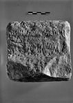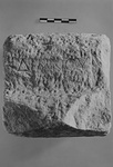 | Description: | Lower part of small stele. Well preserved surface at left edge; other surfaces worn. Small dowel hole in center of curving top with bit of iron in place; projecting base. White marble. ADDENDA Small inscribed block weighing two minae. | |