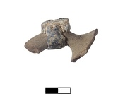 | Description: | Seal attached to pot. Part of a wall and lower half of the vertical handle of a pitcher. Thin slightly gritty fabric; red brown at core, gray brown at surface. A band of lead encircles the handle and the seal is stamped on the thickest top surface; marks of string on each side of the impression. Seal: a seated figure facing right. Type of the "Dionysos of Alcamenes". Same subject as IL 701 (X 988), set in side of unglazed bowl, P 14,431. Cf. Agora XXXIII, nos. 81, 82. | |