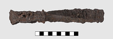 | Description: | Preserved complete in three joining fragments. Blade straight sided tapering gently to a point. Clear midrib. Hilt cast in one piece with blade. Flanged front and back for reception of wooden (?) hilt plates which were attached with iron rivets, three of which are still in position. 840gr | |