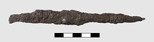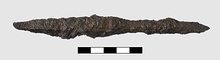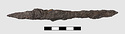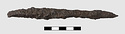 | Description: | Thick incrustation. Refinements of shape cannot be observed. Long, thin and straight. Apparently pointed at one end (for driving into wooden shaft ?). Near other end, section appears to be square, tapering down to a boat-shaped chisel end. Cutting edge possibly rounded. 54.0gr | |