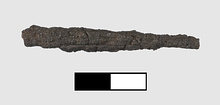 | Description: | Two fragments joining. Part of the shaft, the head and point lacking. Square in section tapering toward one end. 4.0gr | |