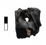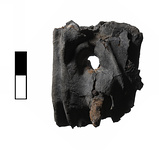 | Description: | One piece broken off during attempt to unfold it. Folded in several layers and transfixed with iron nail. There is a hole from another nail, which is missing. A number of obscure letters on the outside surface. Cannot be unfolded. | |
