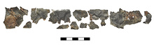 | Description: | Broken into three large and several small pieces upon partial unfolding. Found wadded up and crushed in numerous layers. Hole for nail that has disappeared. A number of obscure letters on inside, including many crosses or "chi 's". | |