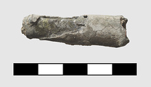 Description:   Rolled curse tablet. Covered in white corrosion.
