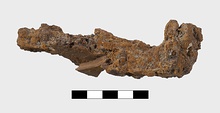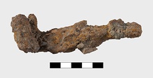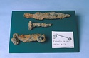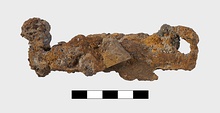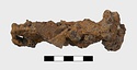 | Description: | Apparently completely preserved, but oxidized and with thick incrustations. Loop at handle and five teeth set at right angles to shaft. | |