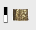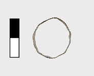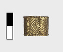 | Description: | Intact broad finger ring. Bent flat when found, but easily opened. Simple circle; sides not profiled. Repousse. Top and bottom, row of dots. Around side, chain of four receding lozenges (straight line, dots, straight line) the angles above and below them filled with receding triangles, the innermost of dots. Slope and scheme virtually identical with J 145. Early Geometric. 1.8gr | |