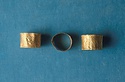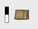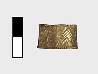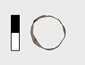 | Description: | Intact broad finger ring. Bent, but easily opened. Simple circle; sides not profiled. Repousse. Top and bottom, row of dots. One side five superimposed zigzags. Shape as J 145. Early Geometric. 1.4gr | |