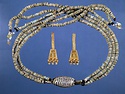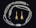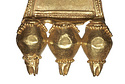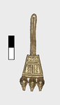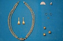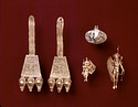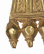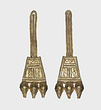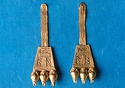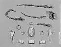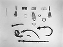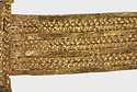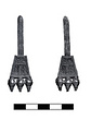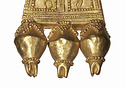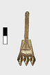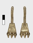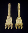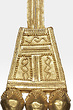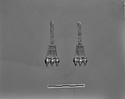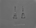 | Description: | Intact granulated earrings. The shafts were bent double when found. Each composed of three parts: shaft (slightly damaged near top of a); trapezoidal plaque; pomegranate finials, decoration in filigree. Strands of rectangular wire, some twisted, and granulation. On plaque: three panels, the upper "running dog", the lower two "guilloche". Early Geometric. Left: 5.9gr, Right: 6.2gr | |