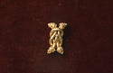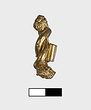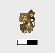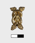 | Description: | Intact. Ornament consists of a loosely drawn knot with the ends (two at each end) terminating in small lion heads. On underside are two loops for attachment. | |