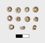 | Description: | Thirteen beads originally: five are complete and in fairly good condition, six are partially complete and two more have disintegrated (in 2 small bags stored with beads). The surface of the beads is peeling and is very friable. Rounded beads, pierced through center. White to light cream-brown glass paste, some with iridescence. Found with bronze wire fragments Β 2244. | |