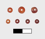 | Description: | Seven carnelian beads of various sizes; all complete, some with minor chipping. Roughly rounded, slightly flattened. Pierced through center. Polished orange to dark red carnelian. | |