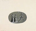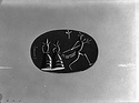 | Description: | The man strides right; behind him are the two female figures in flounced skirts; the man holds a spear or branch; from his waist two lines extend to the first woman. Small symbols in the field to the left and above. According to Dr. Karo "the I-like symbol or pillar to the left is an altar, or simplified "Kultgebaüde". The symbol above, is perhaps a soul. Not much can be said about the head of the man (which appears hardly human) because of the sketchiness of the drawing". The hoop, flat in section, is turned out slightly at either edge. Light gold, very thin. The scene is to be compared with scenes in Evans' "Tree and Pillar Cult", of a man shaking a tree while women look on. The style is to be compared with that of the Tiryns seal with a boat and personages, (a man and a woman). | |