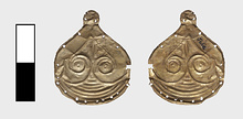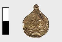 | Description: | This group consists of thirty rosettes, five ivy-leaf pieces and one shell-shaped ornament. Ivy-leaf ornaments: four of them are complete, though slightly bent; one is somewhat broken. Decoration in low repouseé: a conventional ivy-leaf formed by two volutes crowned by curving lines. None are pierced. Cf. J 64. Shell-shaped: lower edge straight, upper edge scalloped; converging flutes running downward; small eight-petalled rosette in center. Pierced at edge. Cf. J 84. Rosette: one of the rosettes is half only; the others are largely complete, though slightly bent and with occasional chips missing. Eight-petalled rosette with central dot; pierced around the edges for attachment. | |