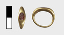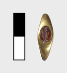 | Description: | Ring with engraved gem. Made of hammered gold, round in section, thin on the inside and thick on the outside. Into the thick outer part a small carnelian is set, engraved intaglio with a standing figure with a large headdress, right hand holding an object, left upraised. | |