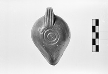 | Description: | On rim, herringbone. On discus, twisted rosette with groove around central filling hole. Handle solid, triple grooved. Nozzle rounded, separated by horizontal groove with diagonal grooves and stamped circles. On bottom, concentric grooves. Reddish-brown glaze. Red clay. Type XXVIII of Corinth collection. | |