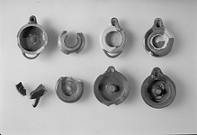 Shallow type with no base; the down sloping rim continuous with the walls. Glazed on the top of the rim, and the bottom of the lamp inside, the glaze fired red save for a band at the outer edge of the rim, where it is black.