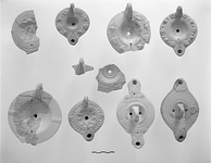 | Description: | Most of the top part, much mended, preserved. On the rim, vine pattern; the discus marked off by two grooves. If the discus had a pattern, it is worn away. Handle pierced, triple grooved. Unglazed. Fine buff clay. Type XXVII of Corinth collection. | |