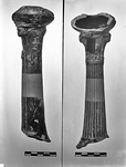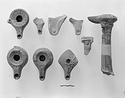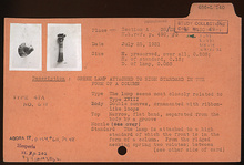 | Description: | Lamp is attached to a high standard of which the front is in the form of a column. From the ridged necking spring two volutes; between them are raised loops, and below, above the necking, a band of raised leaves. The shaft of the column is fluted, and tapers toward the top; at the bottom it flares as if to receive a wide base. The back of the standard is undecorated. Double convex body, ornamented with ribbon-like loops. Narrow top, flat band, separated from the body by a groove. Brownish-black glaze, mottled red by firing at the bottom of the standard; on the lamp it has a metallic sheen. In the middle of the column is a wide reserved band. Attic clay. Mostly related to type XVIII of Corinth collection. Type 47A of Agora collection. ADDENDA The nozzle belonging to this lamp was listed separately as L 213, but has now been joined. Cf. Corinth IV, ii, p. 49, fig 24 and BMC Lamps, p. 37, fig. 30. | |