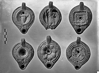 | Description: | On rim, concentric grooves and beading; panels on sides. On discus, gladiatorial scene; two gladiators in full armor one to the right attacking with arm raised, with dagger; one to the left crouching. Handle, grooved, semi-pierced. Nozzle, rounded. On reverse, concentric grooves. Reddish-brown glaze. Red clay. Type XXVIII of Corinth collection. | |